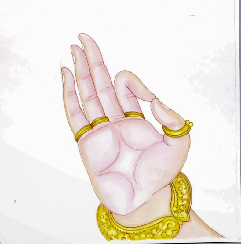 Jnana MudraThis hand gesture is called jnana mudra (also known as chin mudra and yoga mudra), in which the thumb and index finger touch, forming a circle, with the other fingers extended.