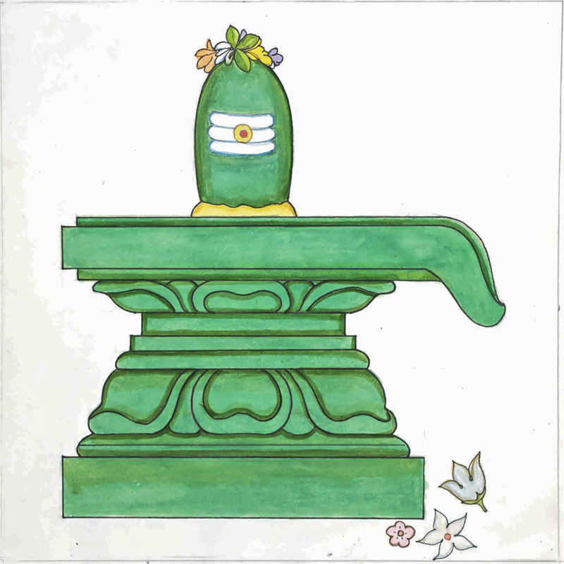 SivalingamThis is the Sivalingam, “mark,” “token” or “sign of God Siva.” The most prevalent emblem of Siva, found in virtually all Siva temples. A rounded, elliptical, aniconic image, usually set on a circular base, the Sivalingam is the simplest and most ancient symbol of Siva, especially of Parasiva, God beyond all forms and qualities. The base, or pitha, represents Parasakti, the manifesting power of God. Lingas are usually of stone (carved or naturally existing, such as shaped by a swift-flowing river), but may also be of metal, precious gems, crystal, wood, earth or transitory materials such as ice. According to the Karana Agama (verse 6), a transitory Sivalingam may be made of 12 different materials: sand, rice, cooked food, river clay, cow dung, butter, rudraksha seeds, ashes, sandalwood, dharba grass, a flower garland or molasses.