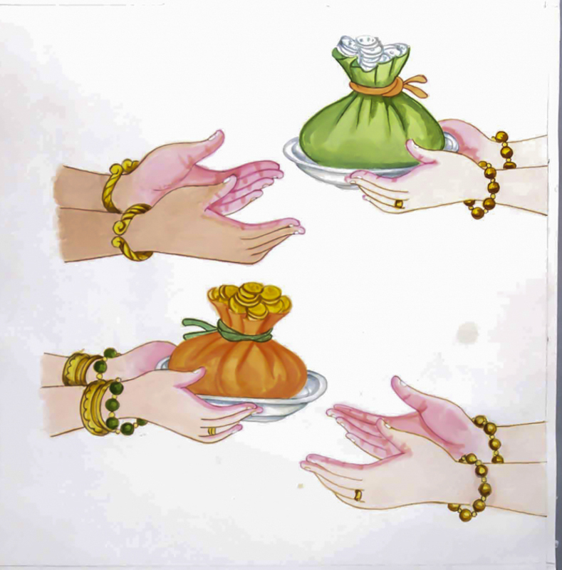 KarmaHere we have a representation of karma, where at the top a person gives a gift and later, at the bottom receives a gift from someone. Karma means “action, deed.” It is among the most important principles in Hindu thought, referring to 1) any act or deed; 2) the principle of cause and effect; 3) a consequence or “fruit of action” (karmaphala) or “after effect” (uttaraphala), which sooner or later returns upon the doer. What we sow, we shall reap in this or future lives. Selfish, hateful acts (papakarma or kukarma) will bring suffering. Benevolent actions (punyakarma or sukarma) will bring loving reactions. Karma is a neutral, self-perpetuating law of the inner cosmos, much as gravity is an impersonal law of the outer cosmos. In fact, it has been said that gravity is a small, external expression of the greater law of karma. The impelling, unseen power of one’s past actions is called adrishta. The law of karma acts impersonally, yet we may meaningfully interpret its results as either positive (punya) or negative (papa)—terms describing actions leading the soul either toward or away from the spiritual goal. Karma is further graded as: white (shukla), black (krishna), mixed (shukla-krishna) or neither white nor black (ashukla-akrishna). The latter term describes the karma of the jnani, who, as Rishi Patanjali says, is established in kaivalya, freedom from prakriti through realization of the Self. Similarly, one’s karma must be in a condition of ashukla-akrishna, quiescent balance, in order for liberation to be attained. This equivalence of karma is called karmasamya, and is a factor that brings malaparipakam, or maturity of anava mala. It is this state of resolution in preparation for samadhi at death that all Hindus seek through making amends and settling differences. Karma is threefold: sanchita, prarabdha and kriyamana.—sanchita karma, as shown on other pillars.