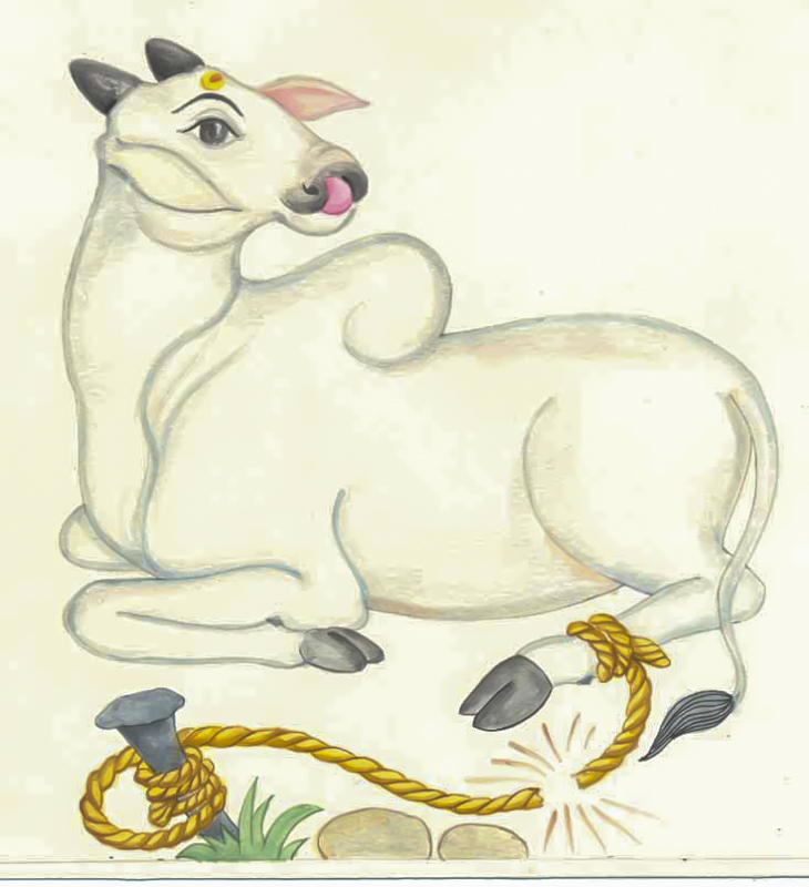 MokshaHere we see a cow who has been fettered with a rope, tied to a post. But the rope has broken, representing moksha, “liberation”—release from transmigration, samsara, the round of births and deaths. Moksha occurs after karma has been resolved and nirvikalpa samadhi—realization of the Self, Parasiva—has been attained. Synonymous with mukti.